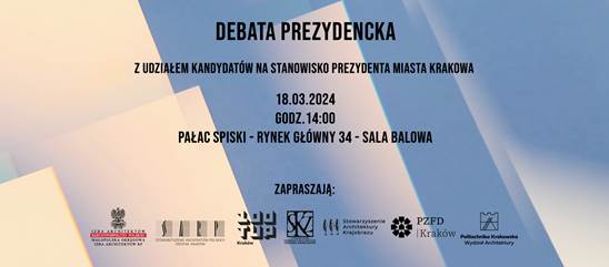 Wszystkich zainteresowanych przyszłością Krakowa zapraszamy do wzięcia aktywnego udziału w DEBACIE PREZYDENCKIEJ z kandydatami na stanowisko Prezydenta Miasta Krakowa. Debata odbędzie się w poniedziałek, 18 marca 2024 r. o godz. 14:00 w Sali Balowej Pałacu Spiskiego (Rynek Główny 34).