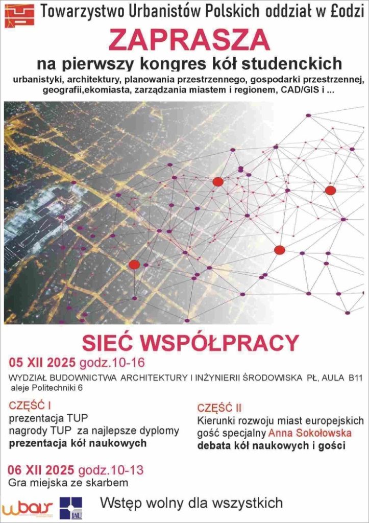 Towarzystwo Urbanistów Polskich Oddział w Łodzi ma zaszczyt zaprosić na Pierwszy Kongres Kół Studenckich pod hasłem „SIEĆ WSPÓŁPRACY”.