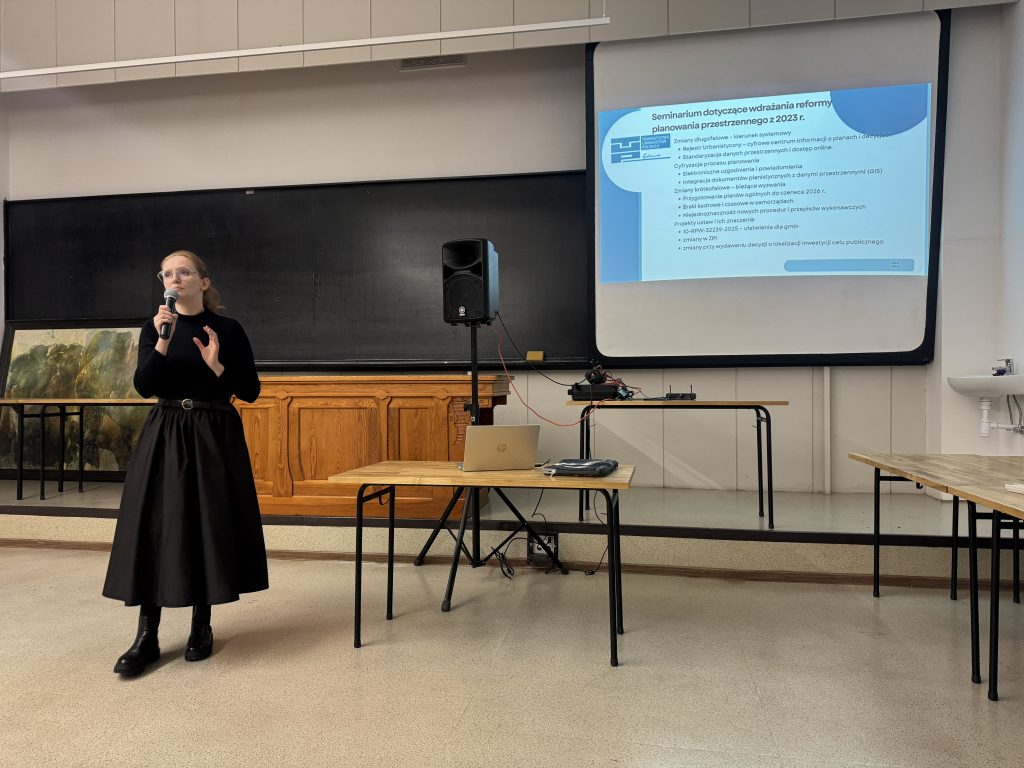 Podczas głównej części spotkania Koleżanka Justyna Wieczerzak, Wiceprezeska Oddziału, omówiła postęp wdrażania reformy planowania przestrzennego oraz jej konsekwencje dla samorządów lokalnych. Obecnie proces wdrażania nowych regulacji jest w kluczowej fazie – gminy przygotowują się do uchwalenia planów ogólnych do czerwca 2026 roku. Wyzwania obejmują niedobór kadr planistycznych, ograniczone terminy i potrzebę równoczesnego prowadzenia innych procedur, w tym aktualizacji danych i dostosowania systemów informatycznych.