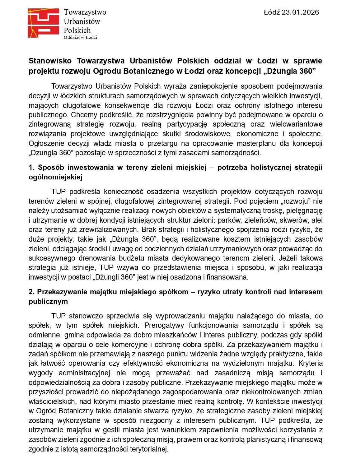 STANOWISKO ws. projektu rozwoju Ogrodu Botanicznego w Łodzi oraz koncepcji „Dżungla 360” Post author:Mateusz Piasecki Post published:28/01/2026 Post category:Oddział w Łodzi Towarzystwo Urbanistów Polskich – Oddział w Łodzi przedstawia stanowisko Oddziału w sprawie projektu rozwoju Ogrodu Botanicznego w Łodzi oraz koncepcji „Dżungla 360”. Może ci się spodobać również Wniosek o nadanie Członkostwa Honorowego TUP 07/11/2025 Doroczna Nagroda Oddziału TUP w Łodzi za najlepszą pracę dyplomową z zakresu urbanistyki, planowania i gospodarki przestrzennej. 18/03/2023 Otwarty nabór kandydatów na Członków Komitetu Doradczego Stowarzyszenia Łódzki Obszar Metropolitalny na lata 2021-2027 20/05/2023