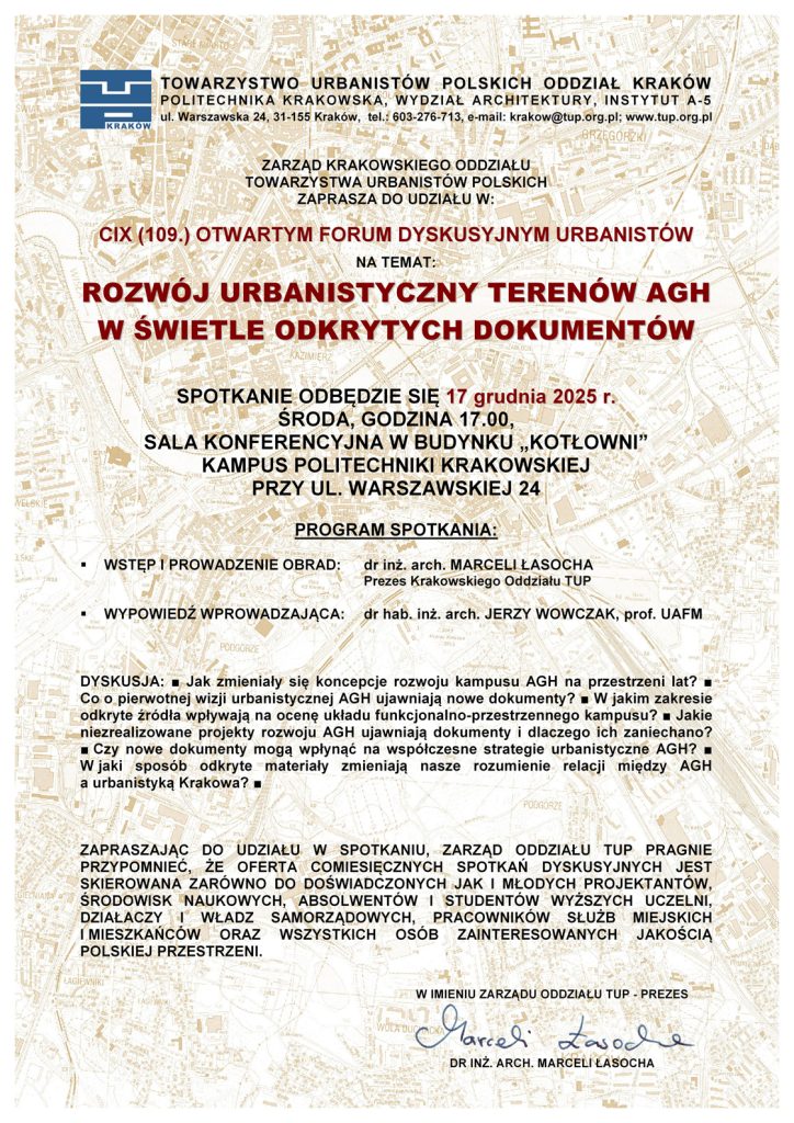 Zarząd Krakowskiego Oddziału TUP zaprasza na ostatnie w tym roku, 109. Otwarte Forum Dyskusyjne Urbanistów, które odbędzie się 17 grudnia 2025 r., godzina 17.00 (!), sala konferencyjna w budynku “KOTŁOWNI” na kampusie Politechniki Krakowskiej, przy ul. Warszawskiej 24. Temat przewodni spotkania: ROZWÓJ URBANISTYCZNY TERENÓW AGH W ŚWIETLE ODKRYTYCH DOKUMENTÓW. Szczegóły w zaproszeniu.